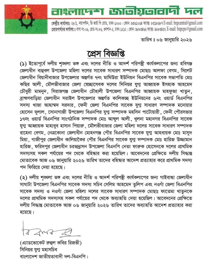 ০৬ জানুয়ারি ২০২৬ তারিখে বিএনপির সিনিয়র যুগ্ম মহাসচিব অ্যাডভোকেট রুহুল কবির রিজভী স্বাক্ষরিত এক প্রেস বিজ্ঞপ্তিতে এই তথ্য জানানো হয়।