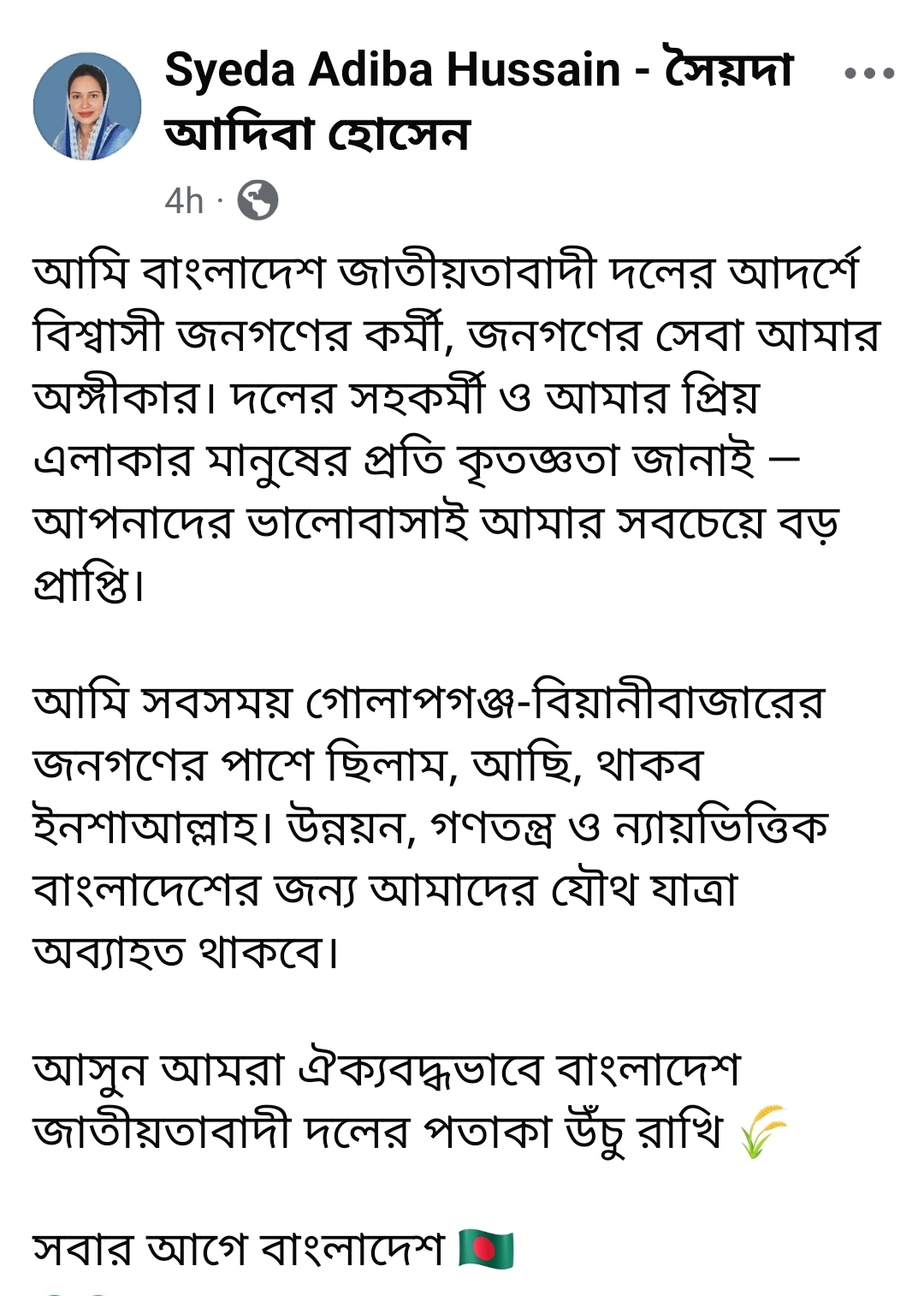 বাংলাদেশ জাতীয়তাবাদী দলের (বিএনপি) আদর্শে বিশ্বাসী জনগণের কর্মী হিসেবে নিজের অবস্থান পুনর্ব্যক্ত করেছেন সিলেট-৬ (গোলাপগঞ্জ-বিয়ানীবাজার) আসনের সাবেক সংসদ সদস্য মরহুম ড. সৈয়দ মকবুল হোসেনের কন্যা সৈয়দা আদিবা হোসেন।
