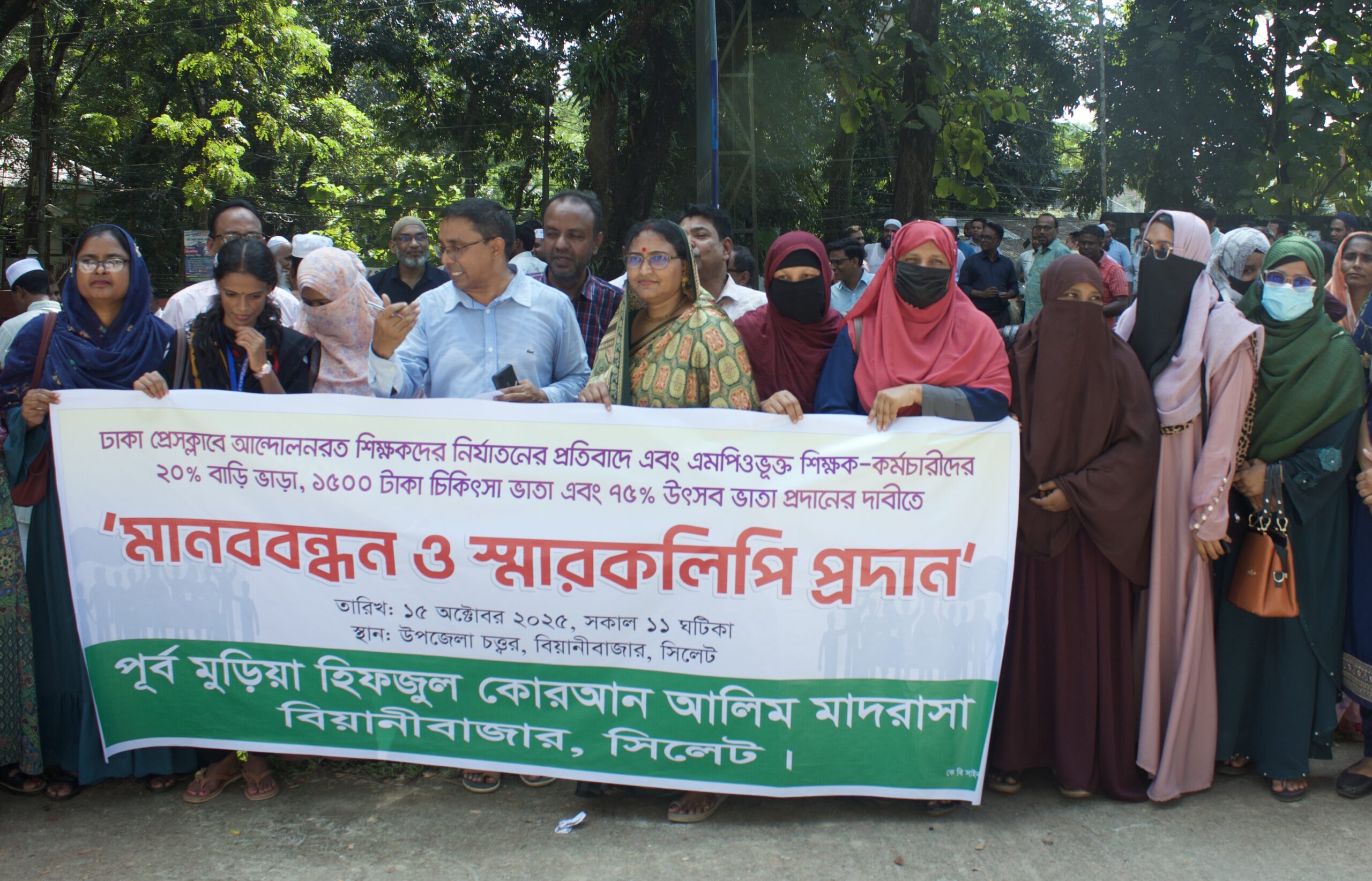 শিক্ষকদের মর্যাদা বৃদ্ধি, বেতন ও সুযোগ-সুবিধা উন্নয়নসহ তিন দফা দাবিতে মানববন্ধন করেছেন বিয়ানীবাজারের শিক্ষকবৃন্দ। বুধবার (১৫ অক্টোবর) দুপুরে বিয়ানীবাজার পিএইচজি সরকারি উচ্চ বিদ্যালয়ের সামনে বিয়ানীবাজার শিক্ষক সমিতির ব্যানারে এ কর্মসূচি পালিত হয়।
