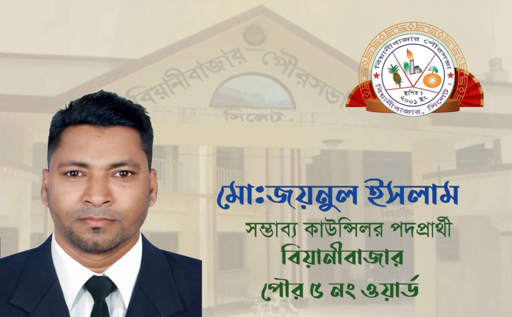 আসন্ন বিয়ানীবাজার পৌরসভা নির্বাচনে ৫নং ওয়ার্ড থেকে কাউন্সিলর পদে প্রতিদ্বন্দ্বিতা করার সম্ভাবনা প্রকাশ করেছেন মো. জয়নুল ইসলাম।