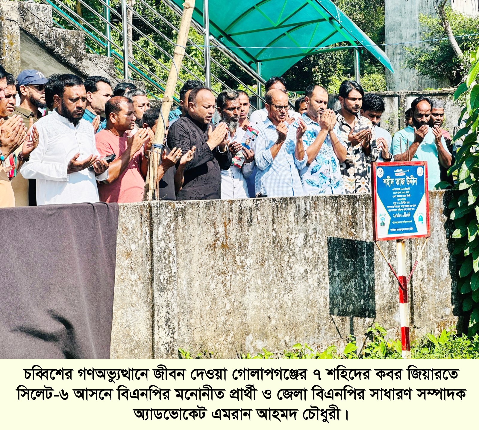 জিয়ারত শেষে অ্যাডভোকেট এমরান আহমদ চৌধুরী বলেন,“বিএনপি ক্ষমতায় গেলে প্রত্যেক শহিদ পরিবারের সুবিচার নিশ্চিত করা হবে। জুলাই-আগস্ট আন্দোলনে সিলেটের সবচেয়ে ত্যাগী উপজেলা হলো গোলাপগঞ্জ, যেখানে সাতজন বিপ্লবী জীবন উৎসর্গ করেছেন। বিয়ানীবাজারেও শহিদ হয়েছেন চারজন। আগামীর রাষ্ট্রনায়ক তারেক রহমানের নির্দেশে বিএনপির নেতাকর্মীরা শহিদ ও আহত পরিবারের পাশে আছেন।”