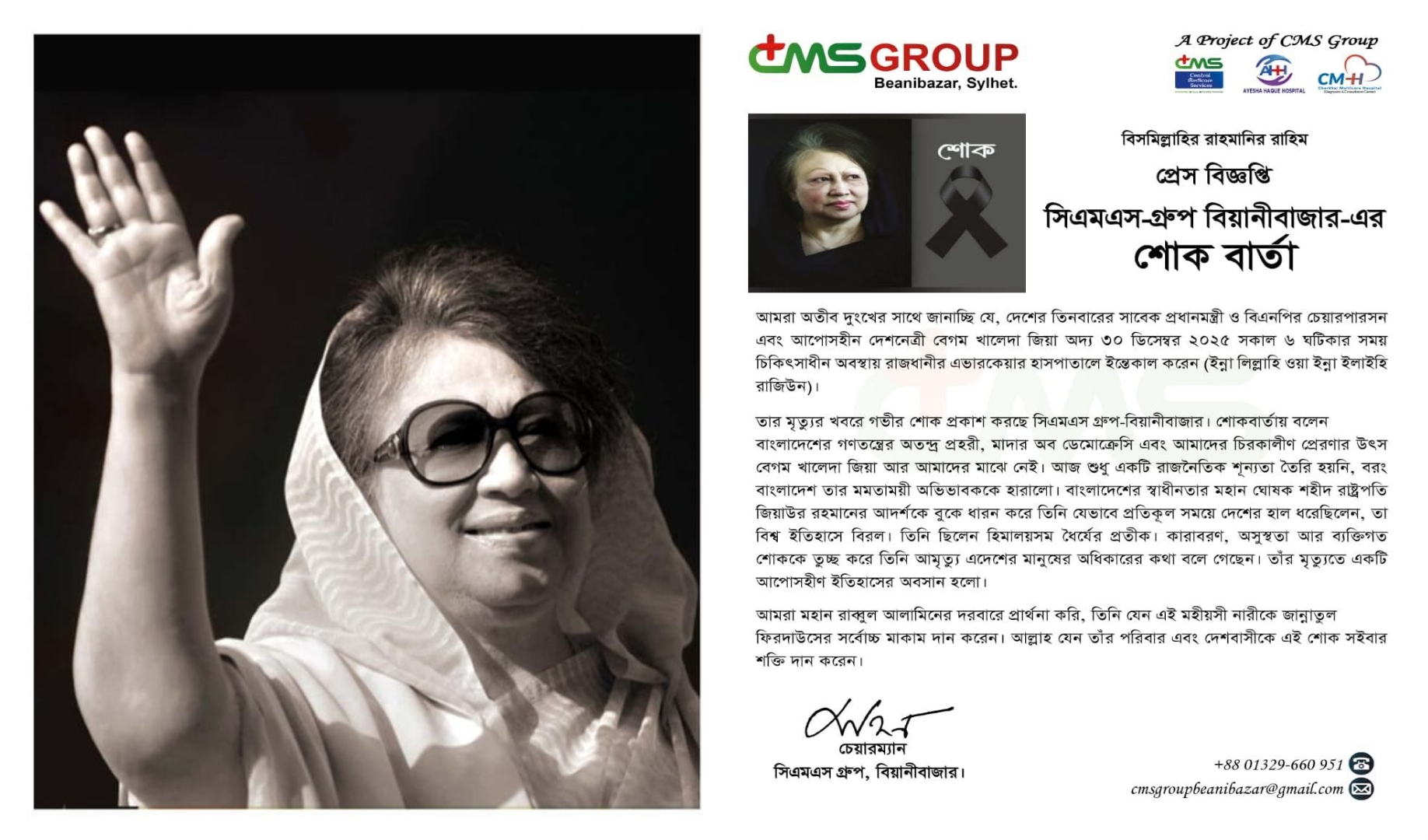 সাবেক প্রধানমন্ত্রী বেগম খালেদা জিয়ার মৃত্যুতে সিএমএস গ্রুপ বিয়ানীবাজারের গভীর শোক
